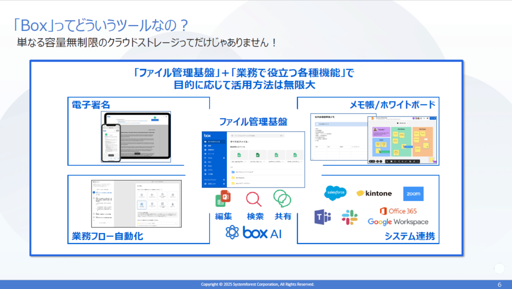 システムフォレスト様からは、コンテンツ管理クラウド「BOX」をご提案いただきました。