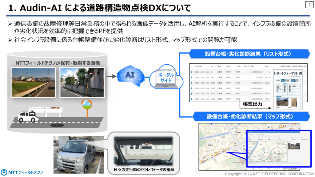 NTTグループ(NTTフィールドテクノ)様からは、社会インフラ設備の台帳整備・劣化診断サービス「Audin AI」をご提案いただきました。
